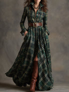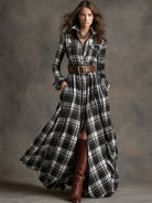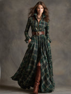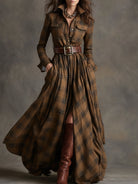 Ova maxi haljina nadahnuta vintage i etno stilom ima rever dizajn i karo uzorak u crvenkastom-smeđoj boji, besprijekorno spajajući retro šarm s toplim etno detaljima za bezvremenski i upečatljiv izgled. Uski kroj pojačava eleganciju, dok bogati karo uzorak dodaje slojevitu, nostalgičnu notu.