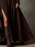 Ova elegantna maksi haljina od tamnobrune umjetne antilope ima upečatljivu prednju prorez i uski kroj, naglašen visokim ovratnikom i dugim rukavima za moderan i sofisticiran izgled.