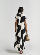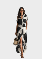 Ova maxi košulja-haljina od laganog šifona stvorena je za žene koje žele udobnost i sofisticiranost u isto vrijeme. Geometrijski uzorak i klasični ovratnik s kratkim rukavima pružaju svježinu i eleganciju, dok prozračan materijal omogućava lako nošenje tijekom cijelog dana.