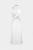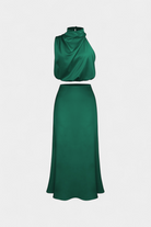 Vibrantna i upečatljiva, ova kombinacija suknje dizajnirana je da se istakne sa svojim drapiranim topom s halter izrezom, delikatnim detaljima i siluetom koja elegantno teče. Pruža lagan i sofisticiran osjećaj koji se divno kreće s tobom.