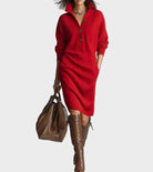 Ova fino pletena haljina odlikuje se plišanom teksturiranom tkaninom koja je jednako ugodna kao i izgleda. Dizajnirana za udobnost bez kompromisa u eleganciji, može se pohvaliti blago opuštenom siluetom koja prekrasno pristaje svakom tipu tijela. Dugi rukavi i dizajn do koljena čine je idealnom za hladnija godišnja doba, dok suptilni dekolte dodaje dašak profinjenosti. Bilo da je kombinirate s čizmama ili štiklama, ova haljina se besprijekorno prilagođava od ležernih spojeva uz kavu do formalnijih večeri.