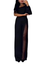 Artemis kombinezon je izraz moderne ženstvenosti – elegantan, samouvjeren i fascinantan. Asimetrični dizajn s jednom slobodnom ramenom i dugim rukavom daje izgledu izražajnost i klasu. Poluprozirni, sjajni detalj na nozi unosi suptilnu senzualnost, a da se pritom ne gubi elegancija.