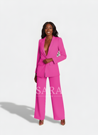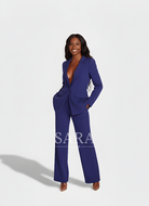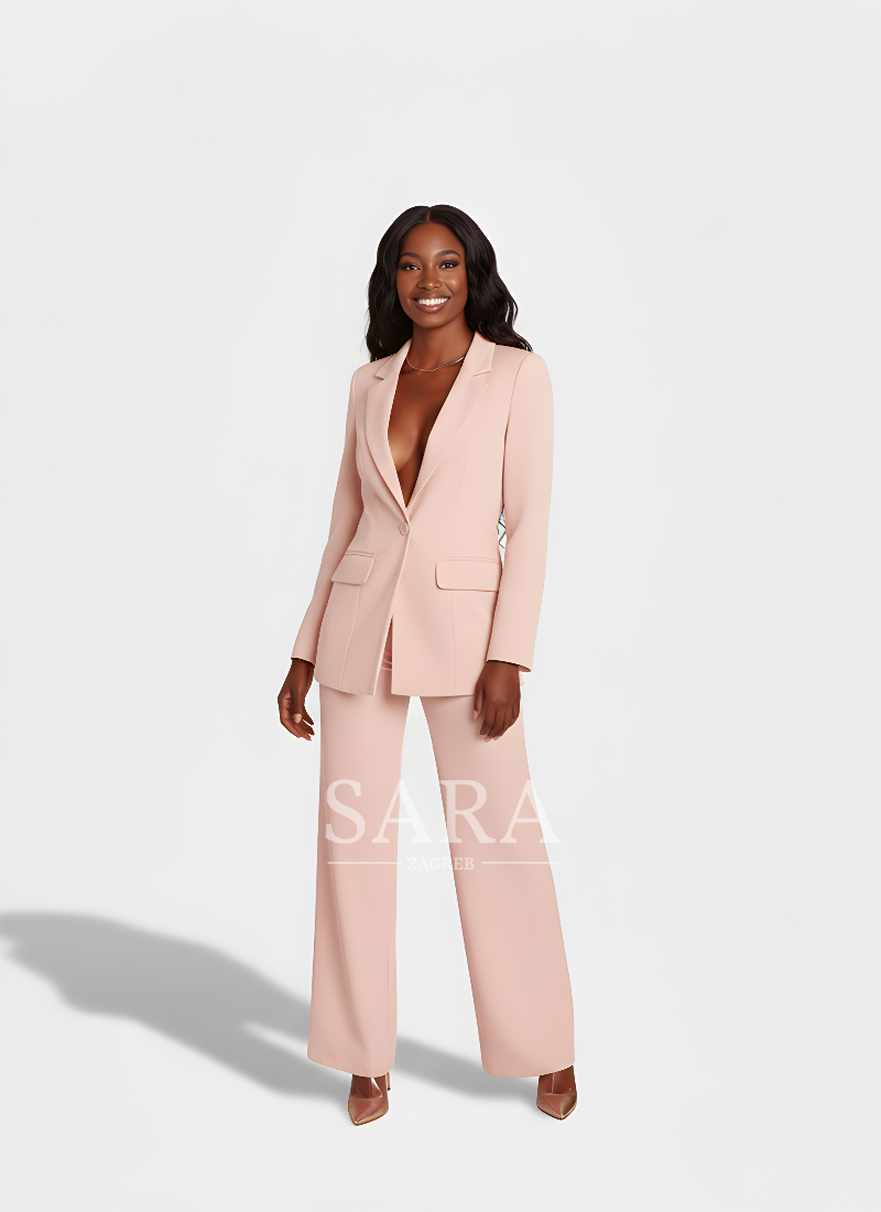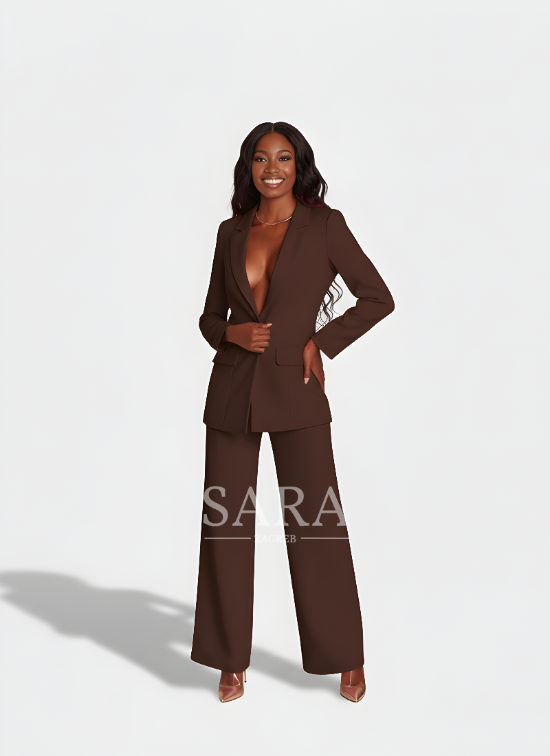 Žensko odijelo koje spaja profinjenost i moderan stav. Dugi blejzer sa špic-reverima, zatvaranjem na jedan gumb i džepovima s preklopom lijepo definira struk i vizualno izdužuje figuru. Hlače ravne, blago širokih nogavica s peglanom crtom osiguravaju čist, produžen profil i slobodu kretanja. Tkanina s lijepim padom pruža udobnost od jutarnjeg sastanka do večernog izlaska. Nosivo kao komplet ili odvojeno – jednako snažno u uredu, na eventu ili za svečanu večeru.