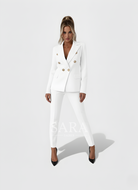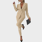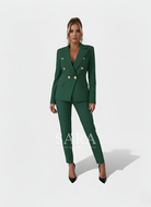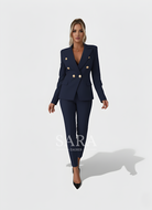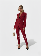 Sofisticirani komplet stvoren za žene koje žele izgledati profesionalno i samouvjereno. Dvoredni sako s dekorativnim gumbima oblikuje struk i daje savršenu strukturu, dok uske hlače cigareta kroja, dužine do gležnja, vizualno izdužuju siluetu. Udobna tkanina s blagim rastezanjem prati pokret i zadržava besprijekoran izgled od jutra do večeri. Džepovi s preklopom i čisti kroj čine ga idealnim za ured, sastanke i svečane prilike — nosite ga kao komplet ili odvojeno.