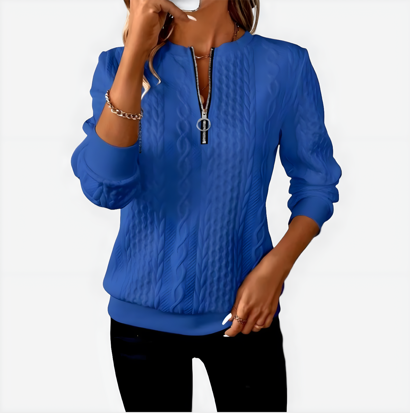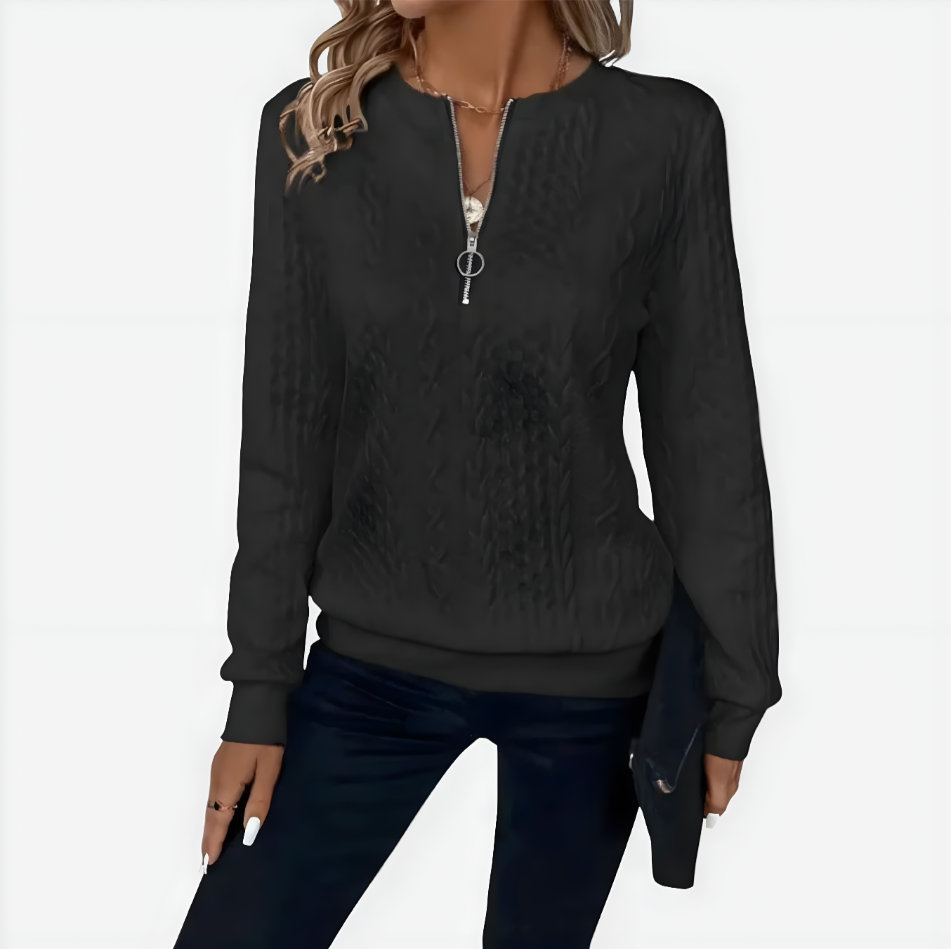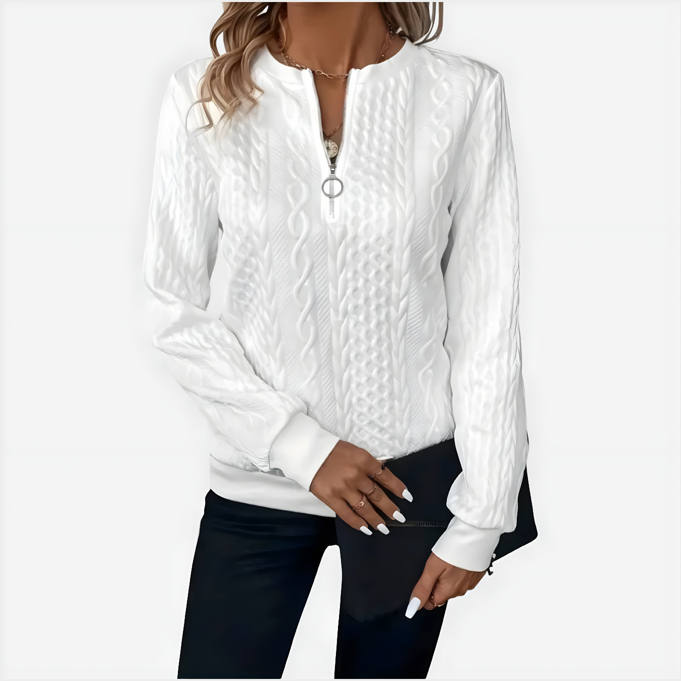 Podignite svoj ležerni stil s našim pletenim puloverom s patentnim zatvaračem AMALIE. Ovaj ženski pulover spaja toplinu i modernu modu, čineći ga neizostavnim komadom vaše garderobe. Izrađen od mekane i izdržljive tkanine, pruža opušteno pristajanje koje jamči chic izgled dok vas grije.