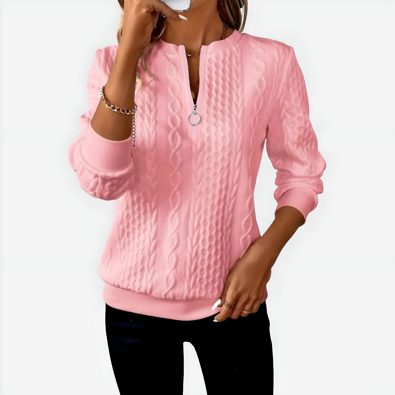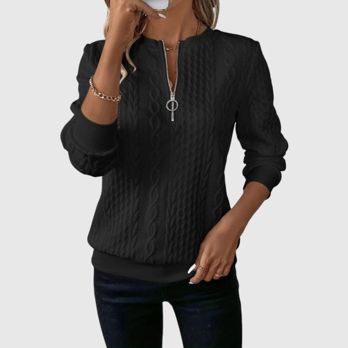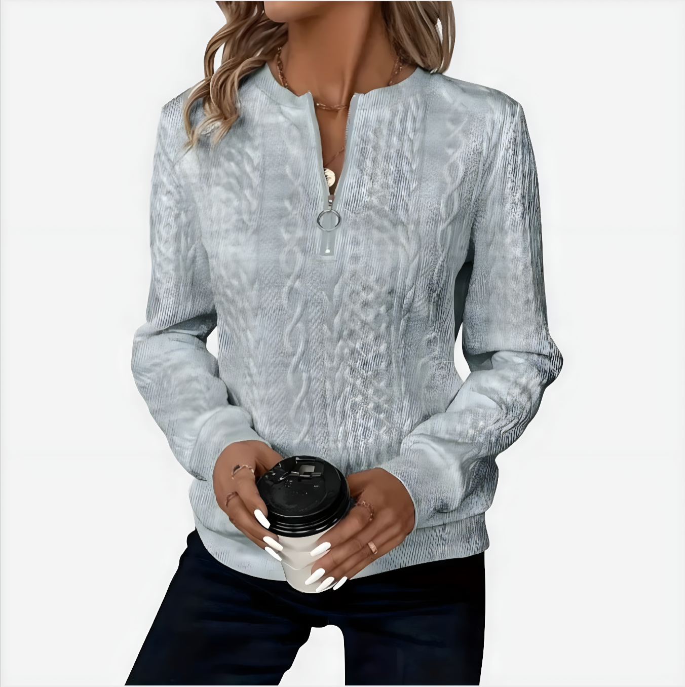 Podignite svoj ležerni stil s našim pletenim puloverom s patentnim zatvaračem AMALIE. Ovaj ženski pulover spaja toplinu i modernu modu, čineći ga neizostavnim komadom vaše garderobe. Izrađen od mekane i izdržljive tkanine, pruža opušteno pristajanje koje jamči chic izgled dok vas grije.