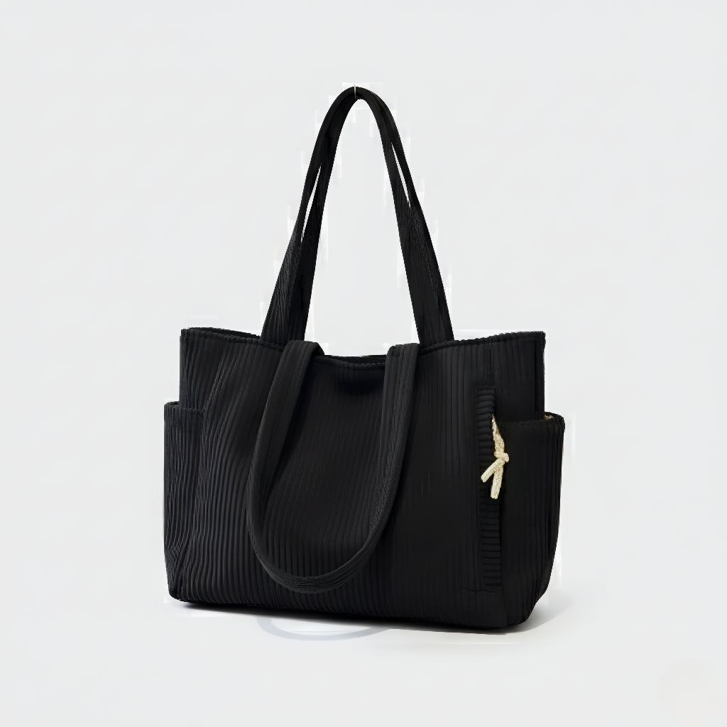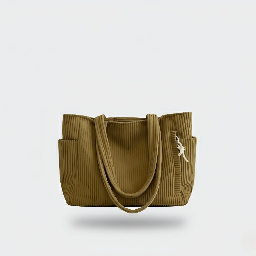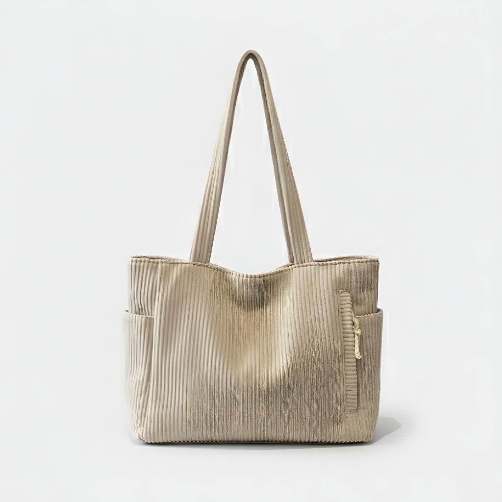 Ova torba kombinira moderan dizajn i funkcionalnost u jednom. Izrađena od mekanog, rebrastog materijala koji pruža ugodan osjećaj na dodir, savršena je za svakodnevnu upotrebu – bilo da idete na posao, fakultet ili opuštenu šetnju gradom. S prostranim unutarnjim dijelom i dodatnim bočnim džepom, vaše stvari uvijek će biti organizirane i lako dostupne.