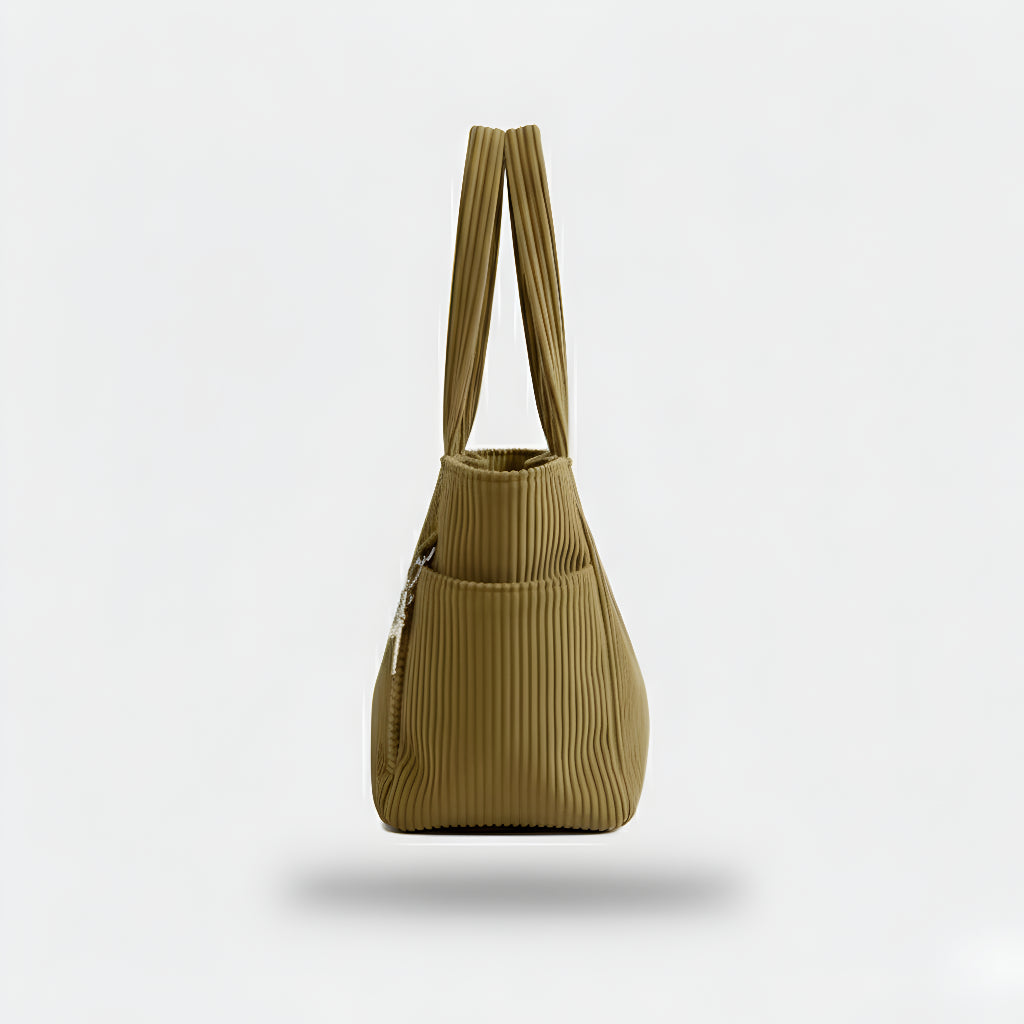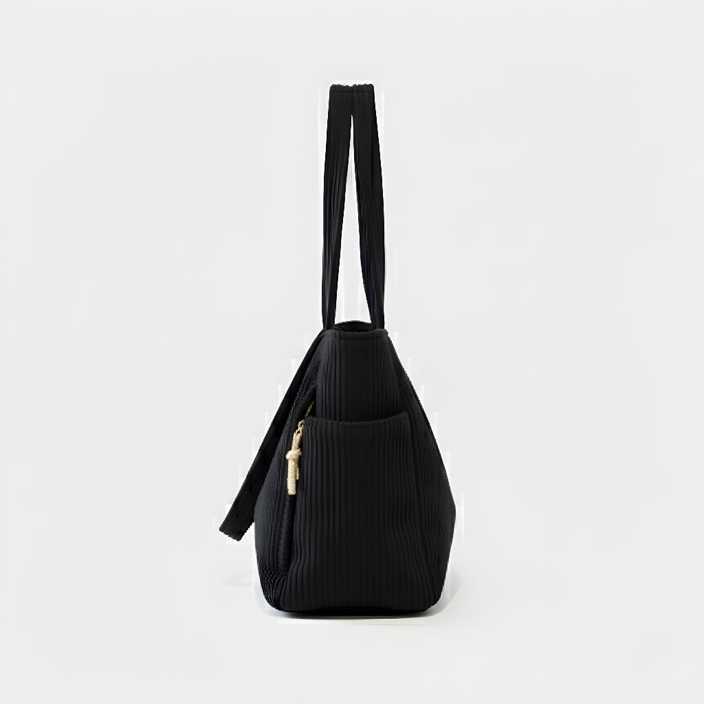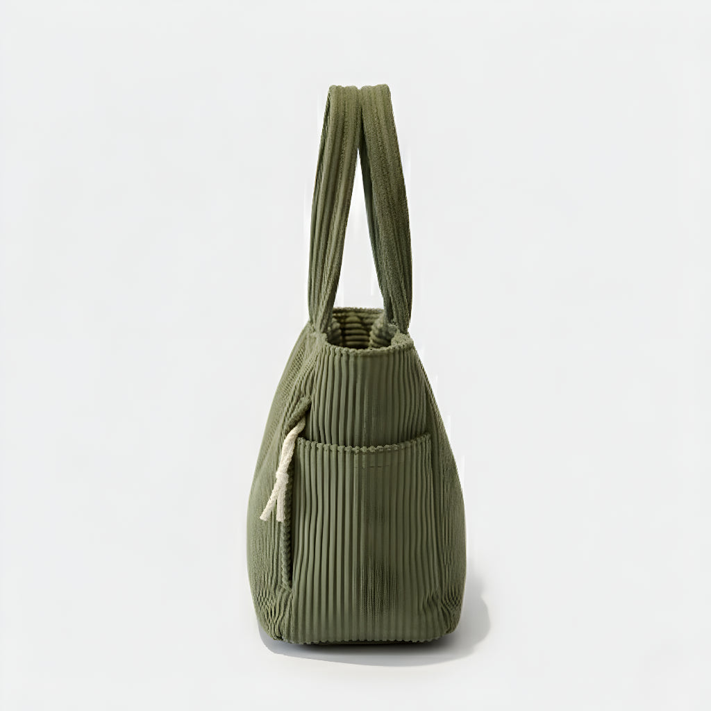 Ova torba kombinira moderan dizajn i funkcionalnost u jednom. Izrađena od mekanog, rebrastog materijala koji pruža ugodan osjećaj na dodir, savršena je za svakodnevnu upotrebu – bilo da idete na posao, fakultet ili opuštenu šetnju gradom. S prostranim unutarnjim dijelom i dodatnim bočnim džepom, vaše stvari uvijek će biti organizirane i lako dostupne.