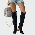 Ženske visoke čizme od smešnog suede materijala, s elegantnim dizajnom koji kombinira klasični western stil s modernim linijama. Visoki okov obavija nogu pružajući ženstvenost i eleganciju, dok stabilna potpetica donosi visinu i udobnost. Bezvremenski komad koji se može nositi s haljinama, suknjama ili skinny trapericama, stvarajući elegantne outfite s stilom.