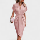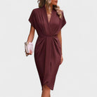 Elegantna midi haljina s profinjenim V-izrezom, blagim naborima u struku i diskretnim prorezom koji produžuje siluetu. Mekana, podatna tkanina lijepo pada i pruža udobnost kroz cijeli dan, dok čiste linije omogućuju lako stiliziranje – od poslovnih prilika do svečanih večeri.